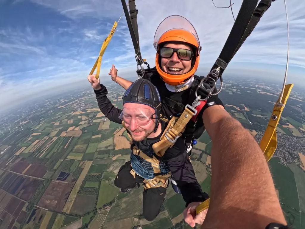 Erleben Sie Ihren ersten Fallschirmsprung sicher und entspannt an der Seite eines erfahrenen Tandemmasters.